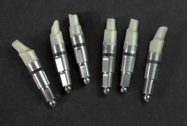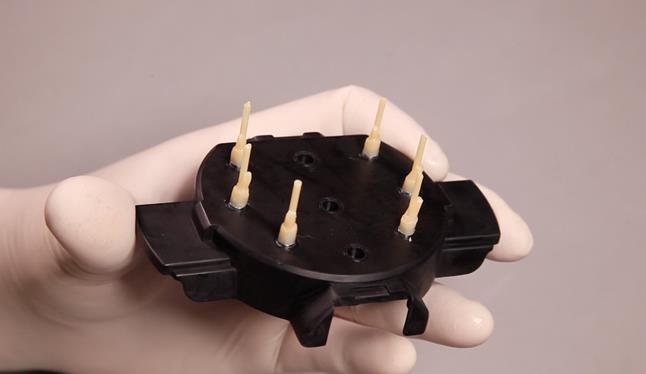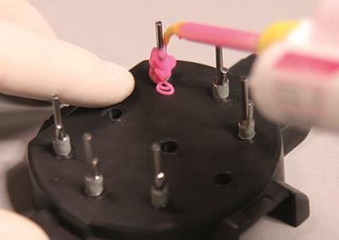 из гнёзд нижней части коробки извлекаются аналоги с дубликатами абатментов, литники обрезаются и аналоги с дубликатами устанавливаются на модель.