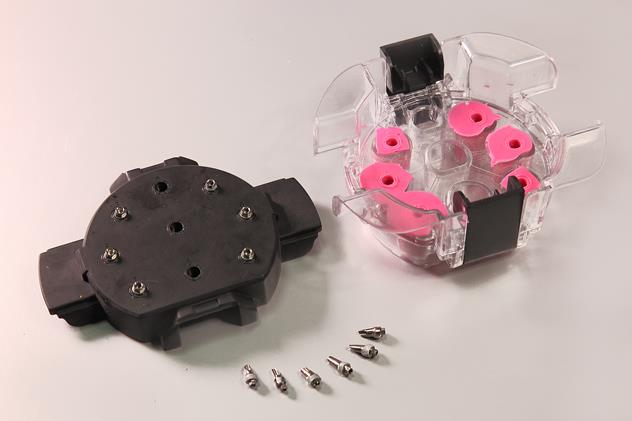 Когда верхняя часть коробки установлена на нижней, удлинённые винты, которыми абатменты прикреплены к аналогам, выходят через отверстия.