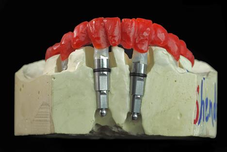 Таким образом, из лаборатории в клинику отправляется модель с дубликатами, на которых установлена композиция основы каркаса будущей протезной конструкции, а также временный мостовидный протез и индивидуально изготовленные абатменты (для удобства абатменты установлены на специальной матрице).