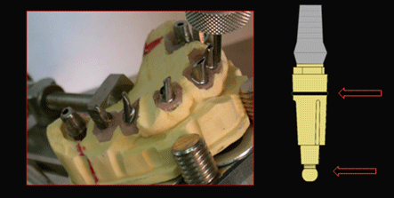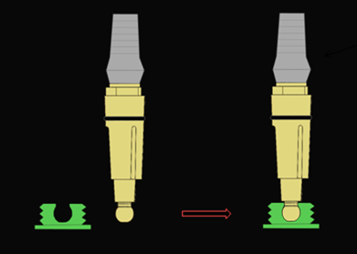 Сферический выступ на апексе аналога (2-ой стабилизирующий элемент) является частью шарикого замкового соединения. Он защелкивается в соответствующий капроновый колпачок, удерживающийся в теле модели после её отливки. Таким образом обеспечивается стабильная устойчивость аналога во время фрезеровки закреплённого на нём абатмента .